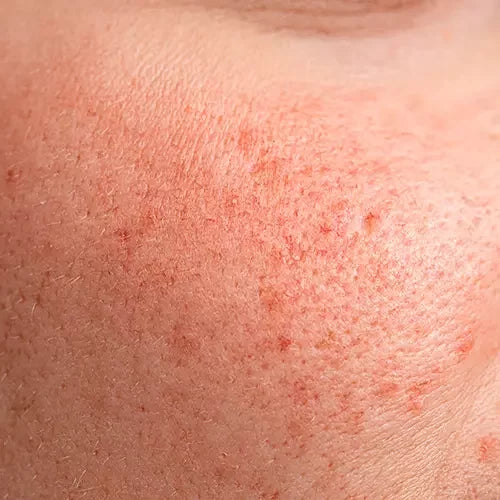 Una condición que causa enrojecimiento intenso en mejillas y nariz, a veces con pequeños vasos visibles e irritación.